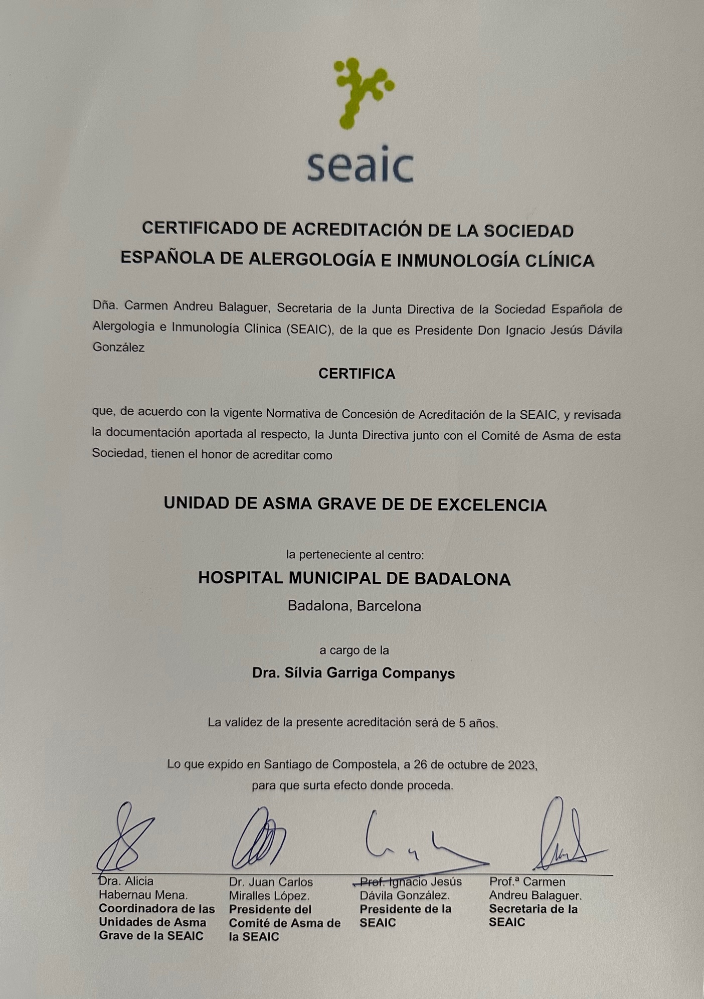 Acreditació SEAIC Unitat d'asma greu d'excel·lència Hospital Municipal de Badalona (Octubre 2023) [pdf]