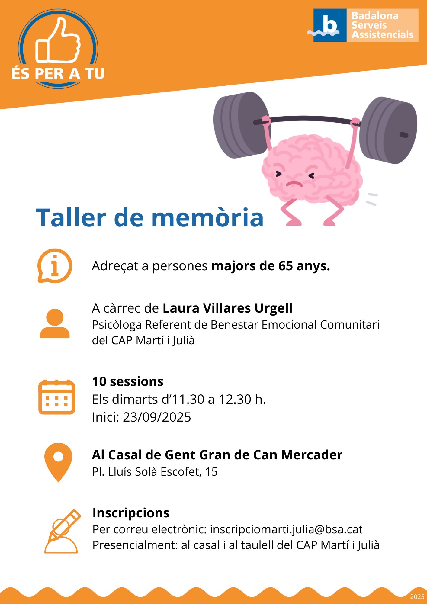 Inscripcions per correu electrònic a inscripciomarti.julia@bsa.cat o presencialment al casal i al taulell del CAP Martí i Julià.